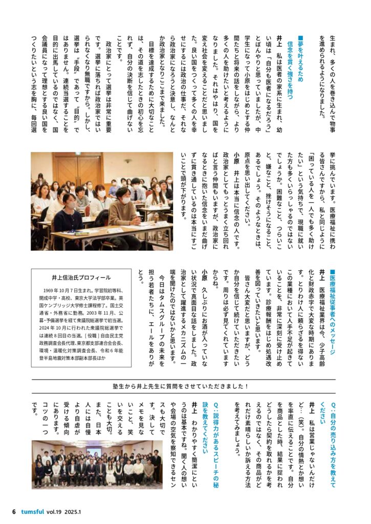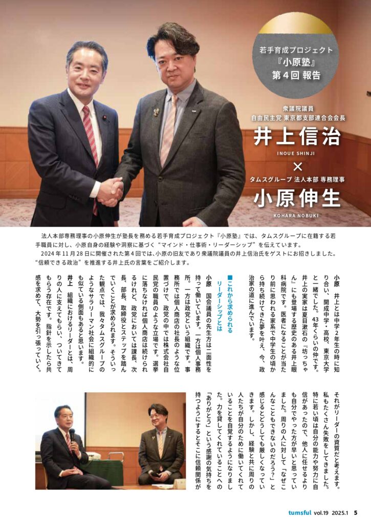 広報誌『tumsful』に第四回小原塾の特集記事が掲載されました! ニュース 2025.01.292025.02.03 広報紙『tumsful』vol.19に、第四回小原塾 井上先生×小原本部長による特別対談講演の特集記事が掲載されております。以下リンクから是非ご覧ください✨📖https://x.gd/xSQ30
